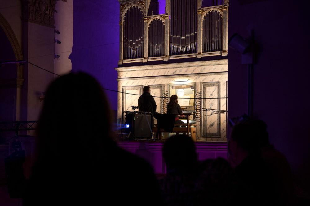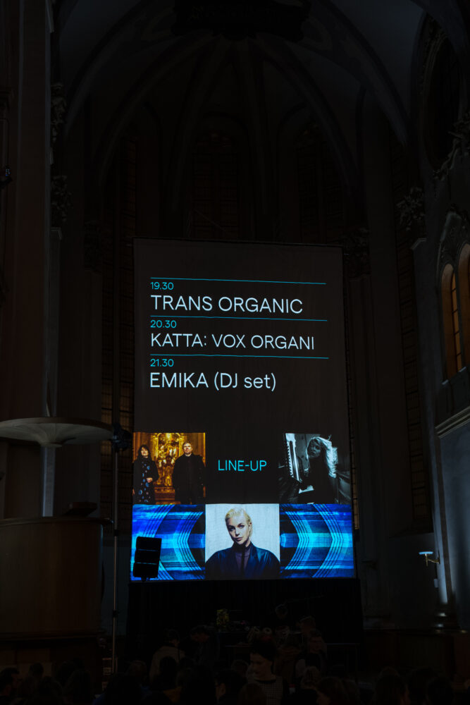 Tento nevšední večer zahájilo v 19:30 duo Trans Organic – hudební projekt Markéty Schley Reindlové a Tomáše Reindla. V mystickém osvětlení kostela, s diváky částečně sedícími v lavicích a částečně postávajícími na emporách, duo představilo hodinovou smršť zvuků a vizuálů Ivety Kratochvílové (Bionic), vycházející z kombinace tradičního zvuku varhan s interaktivní elektronikou, dalšími nástroji i reprodukovanými úryvky náboženských textů. Svou show přesvědčivě demonstrovali, že varhany mohou překročit hranice tradiční hudby a otevřít se takovýmto novým možnostem.