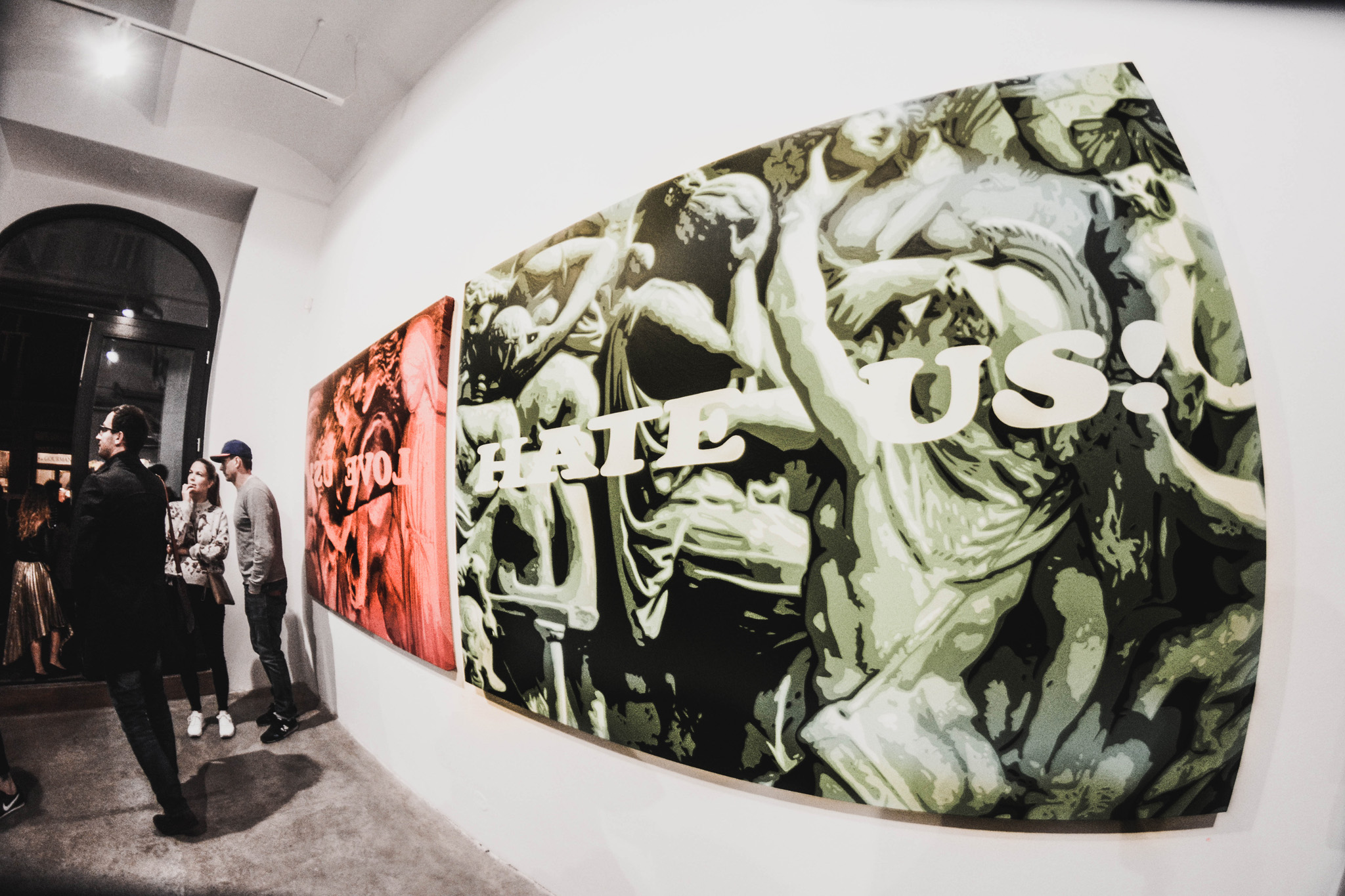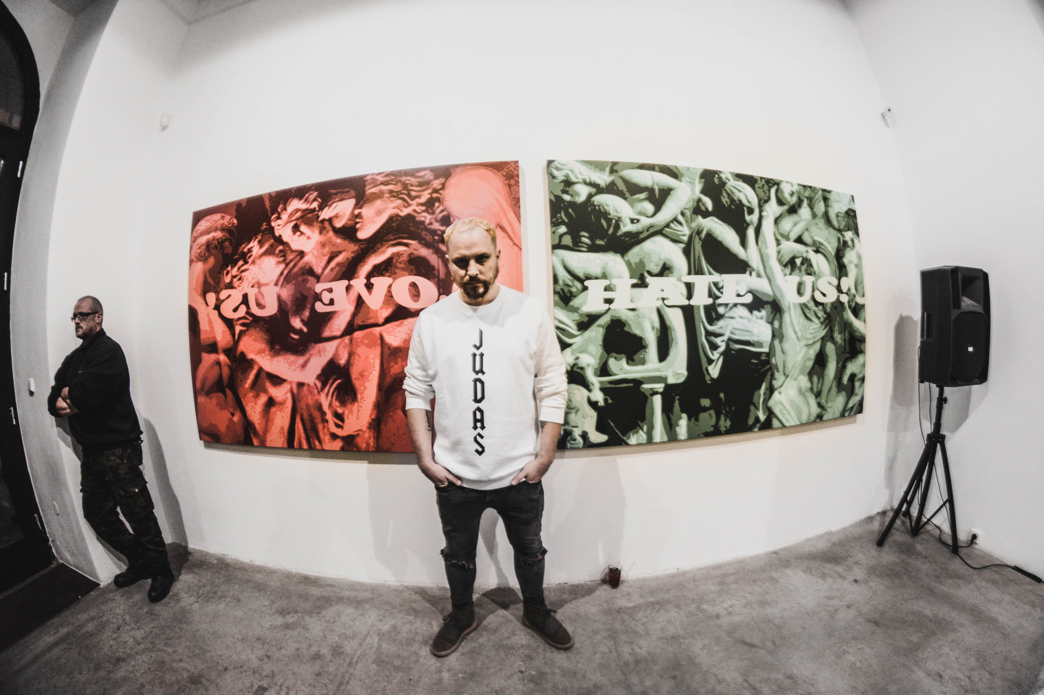 Pastova díla jsou vytvořena za použití olejomalby a nezklamávají ničí očekávání. Hned u vstupu do galerie můžeme zpozorovat dílo skládající se ze dvou obrazů. Náboženské motivy, dvě kontrastní barvy a vylučující se věty „Love us! Hate us!“ zobrazují konflikt mezi něčím všedním a nevšedním.